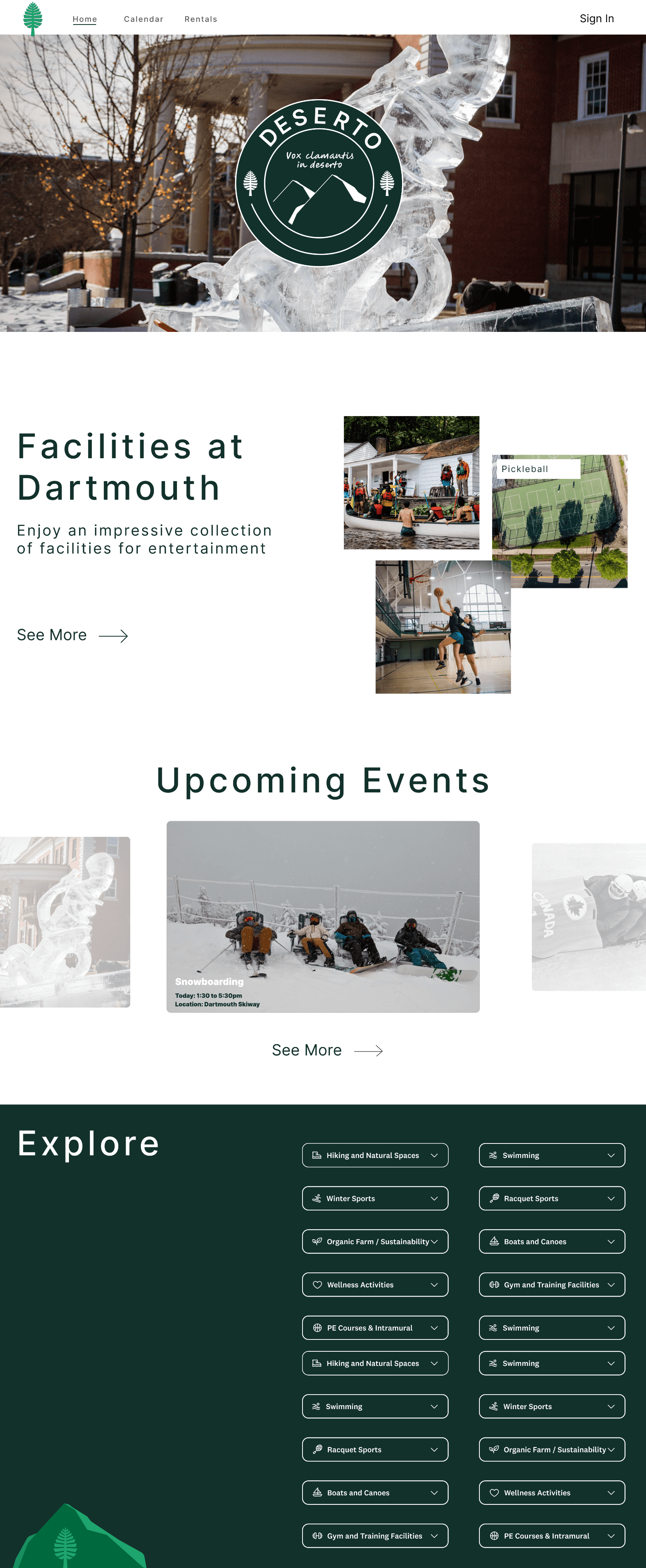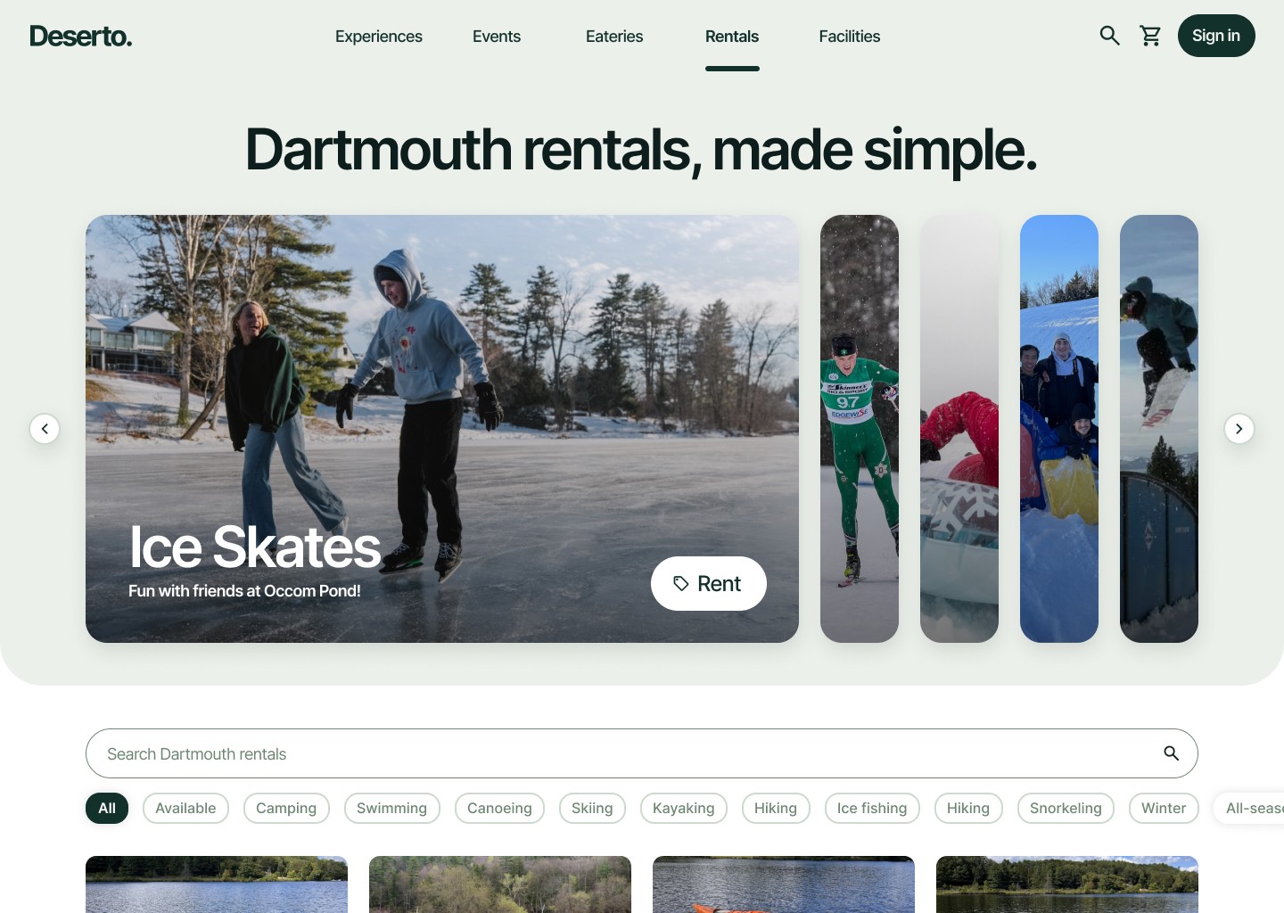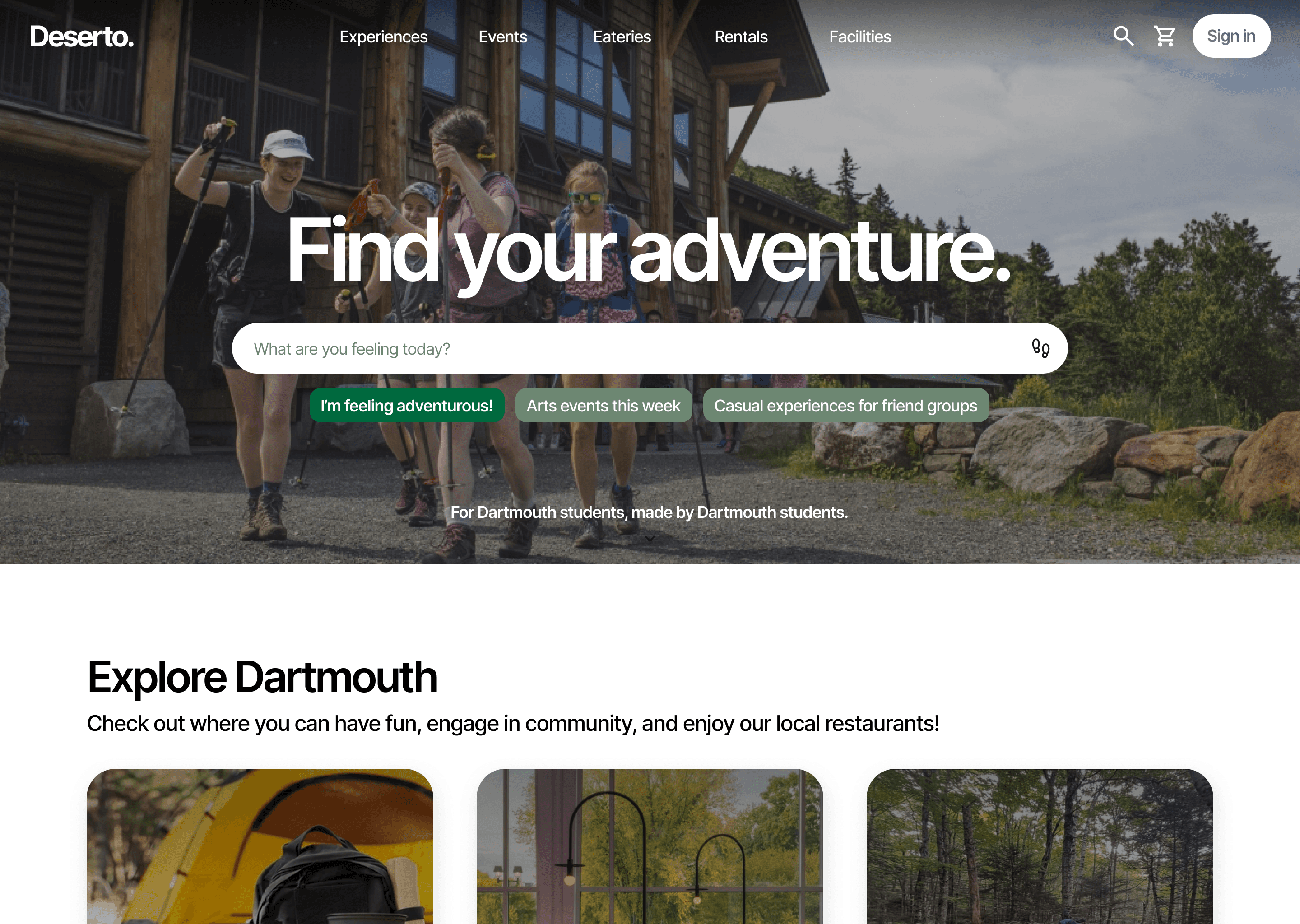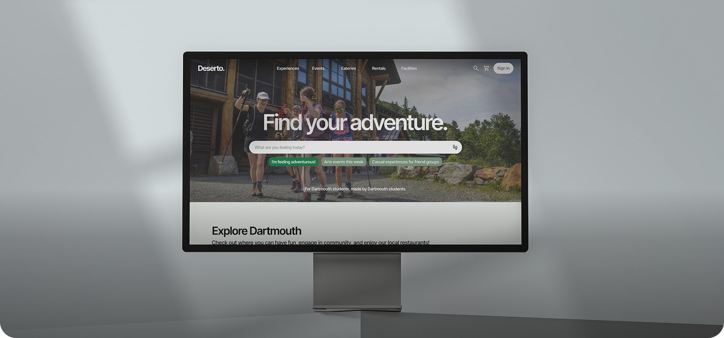 Deserto is a centralized discovery platform that helps Dartmouth students find outdoor activities, campus events, rentals, and eateries — all in one place.