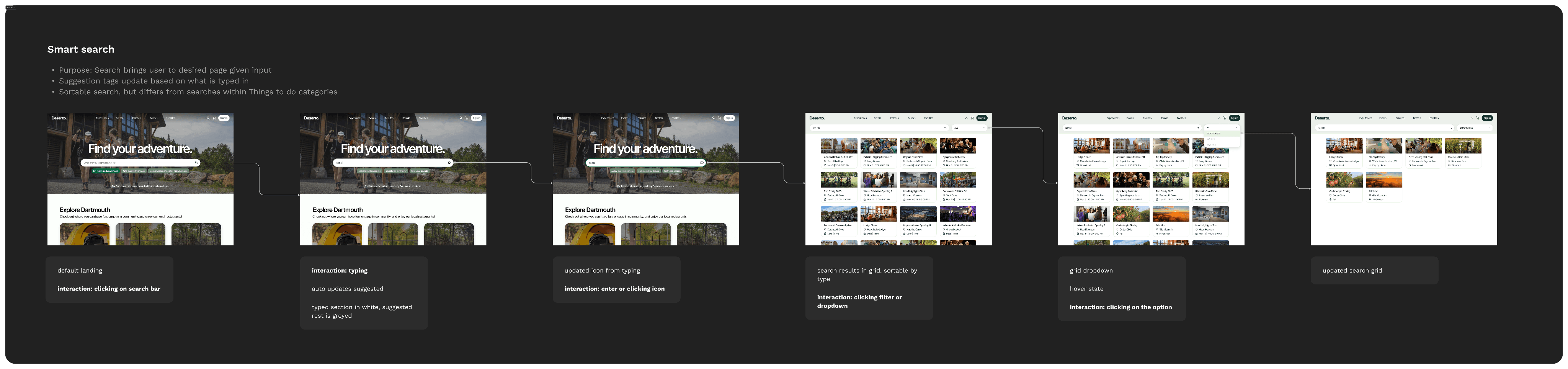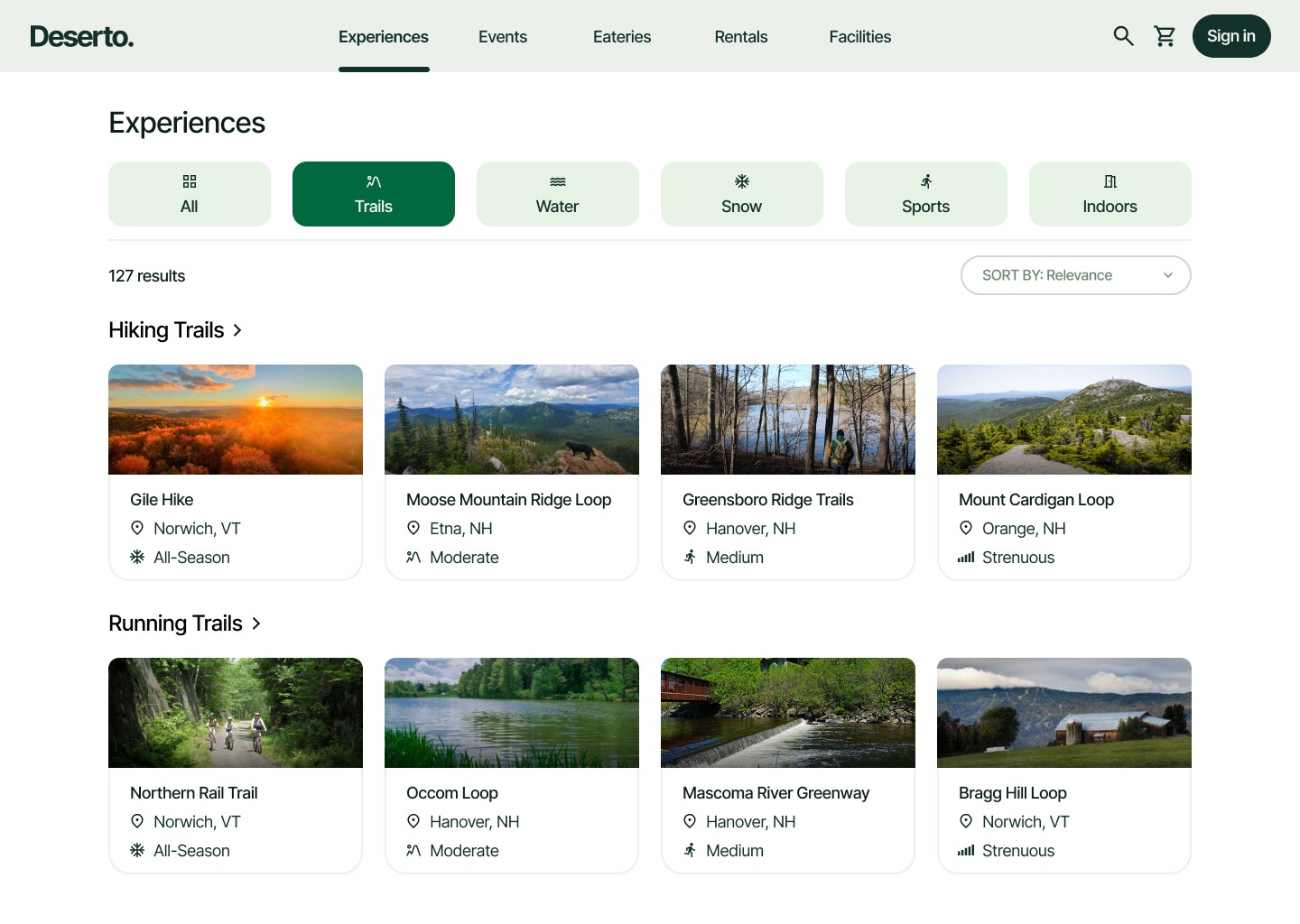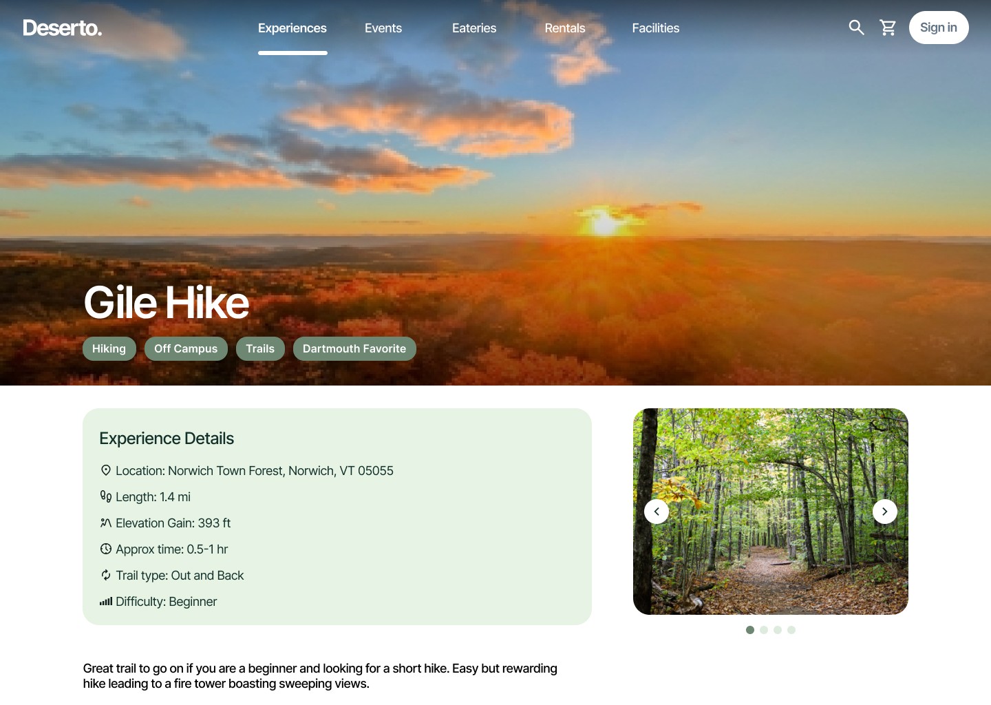 Deserto is a centralized discovery platform that helps Dartmouth students find outdoor activities, campus events, rentals, and eateries — all in one place.