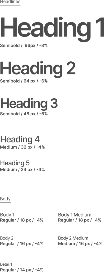 Typography scale (H1–H5, body variants, detail 1) and full colour palette defined as named variables — applied consistently across every component and screen